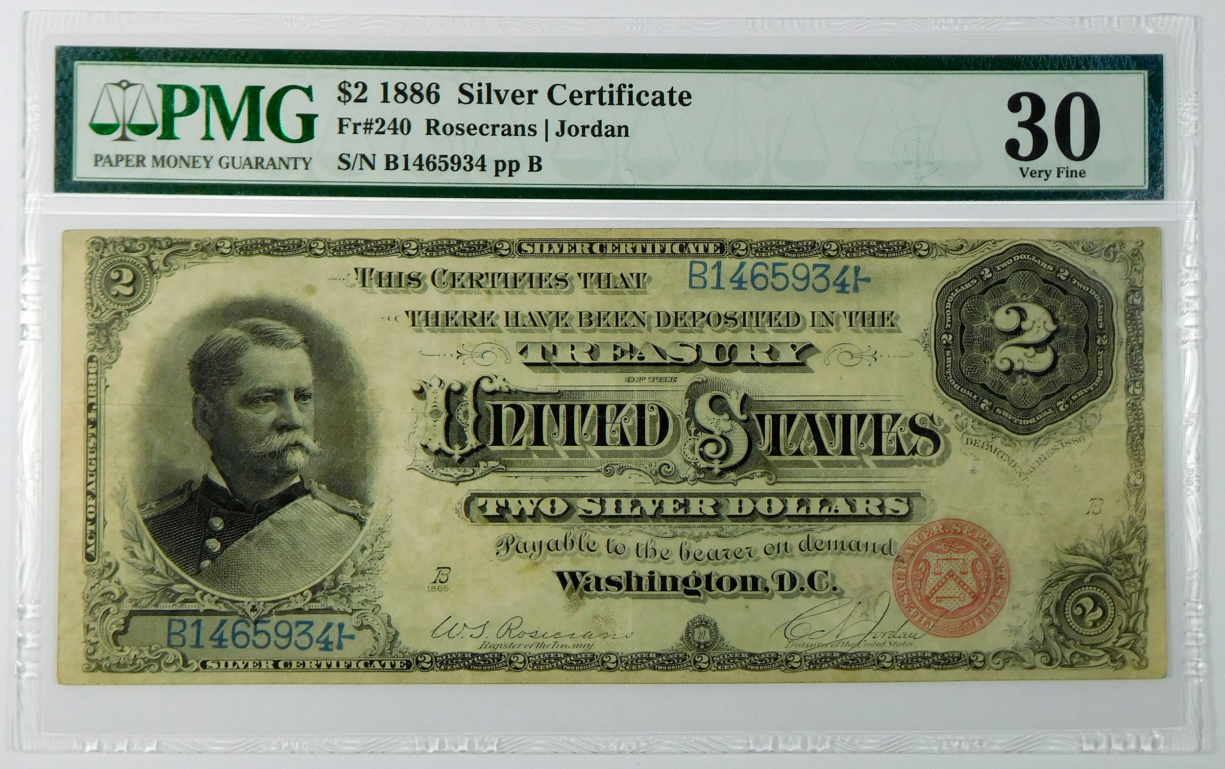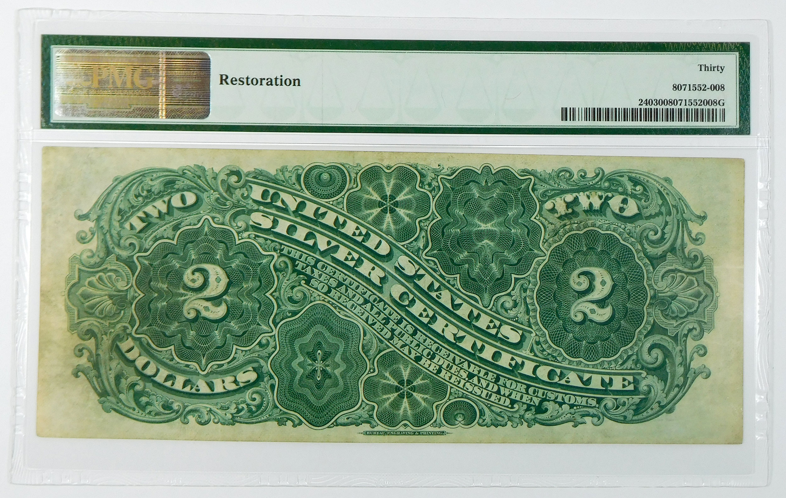 Center horizontal fold, restoration on the upper right corner. S/N B1465934, portrait of Gen. Winfield Scott Hancock at left.