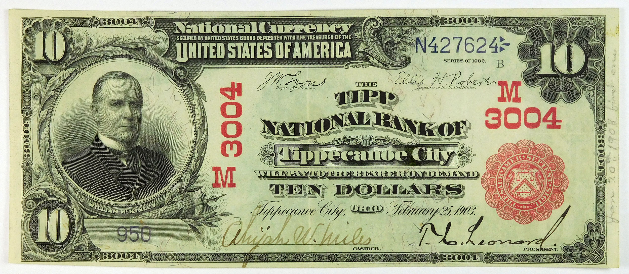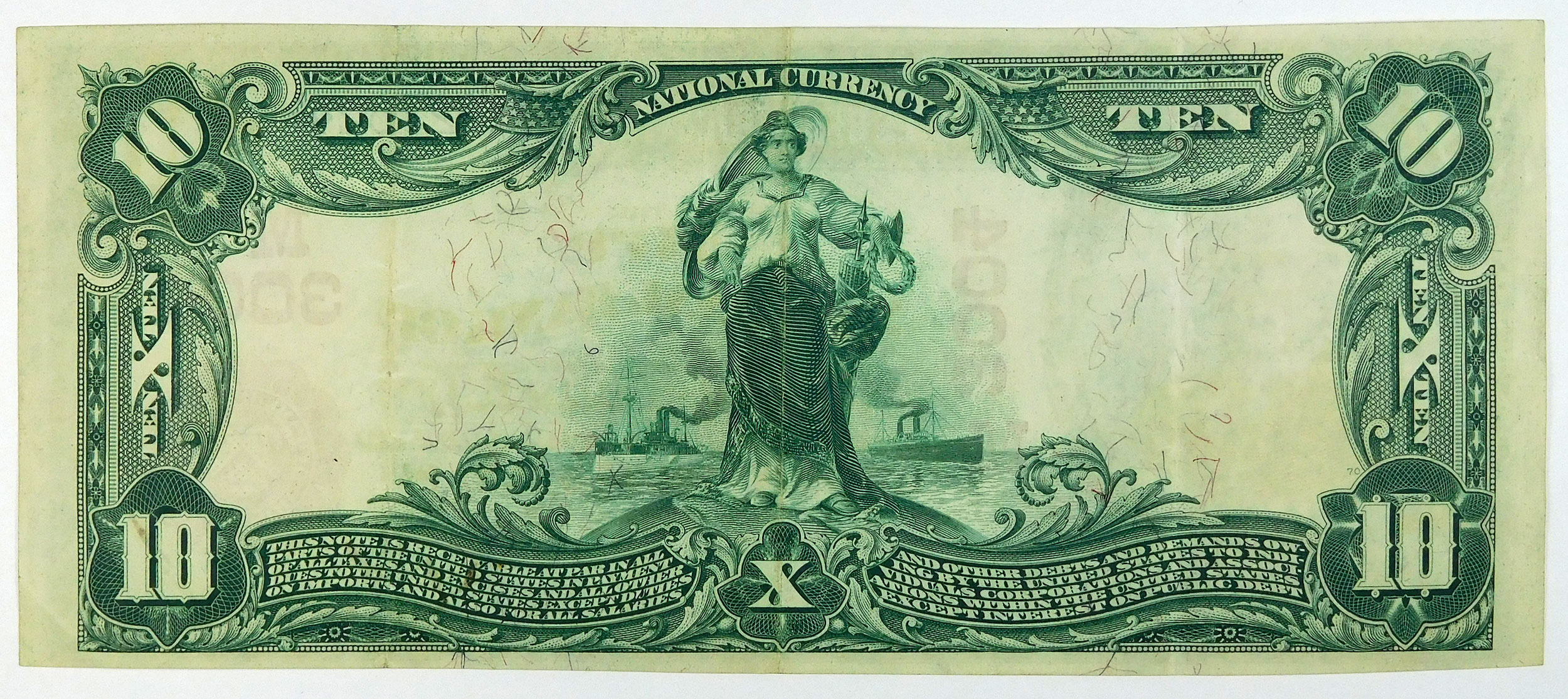 Very attractive note with a few creases, folds and pencil writing along the right margin.