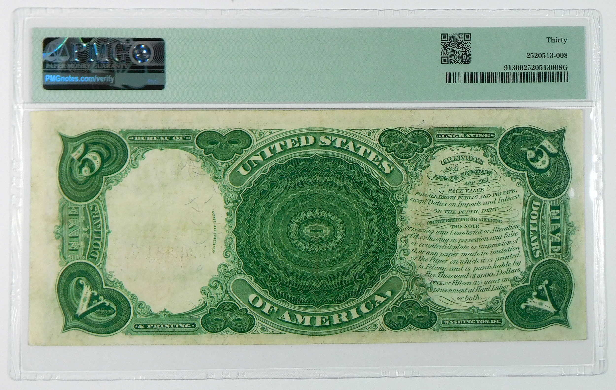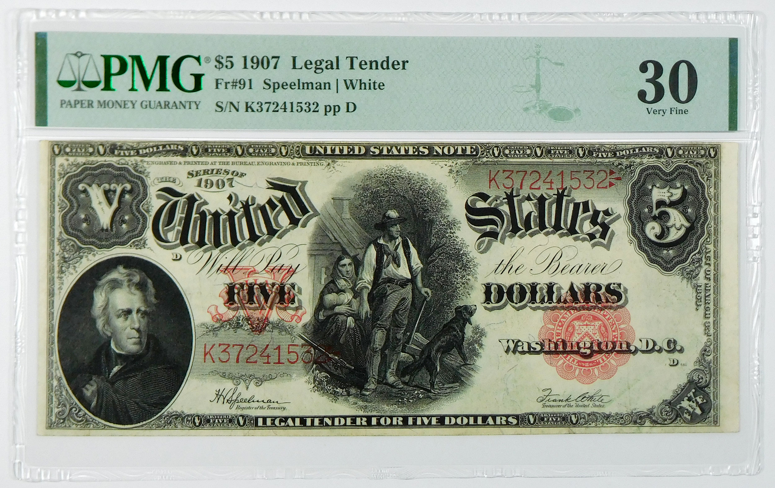 1907 $5 Legal Tender “Woodchopper” – Fr#91 – PMG 30 Very Fine