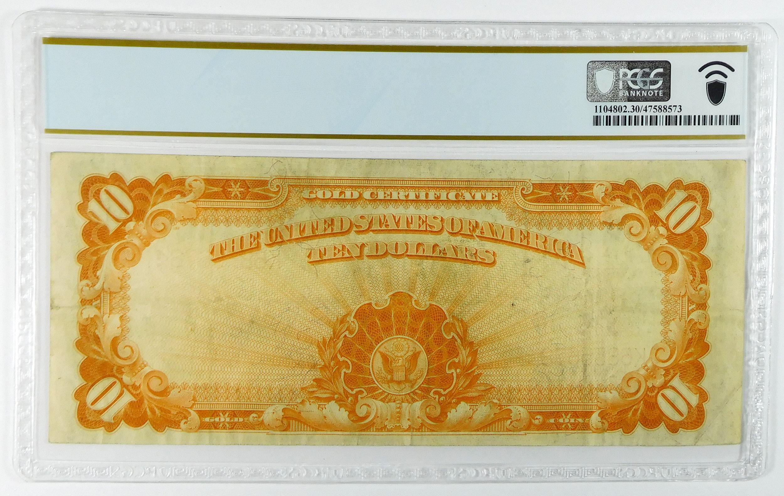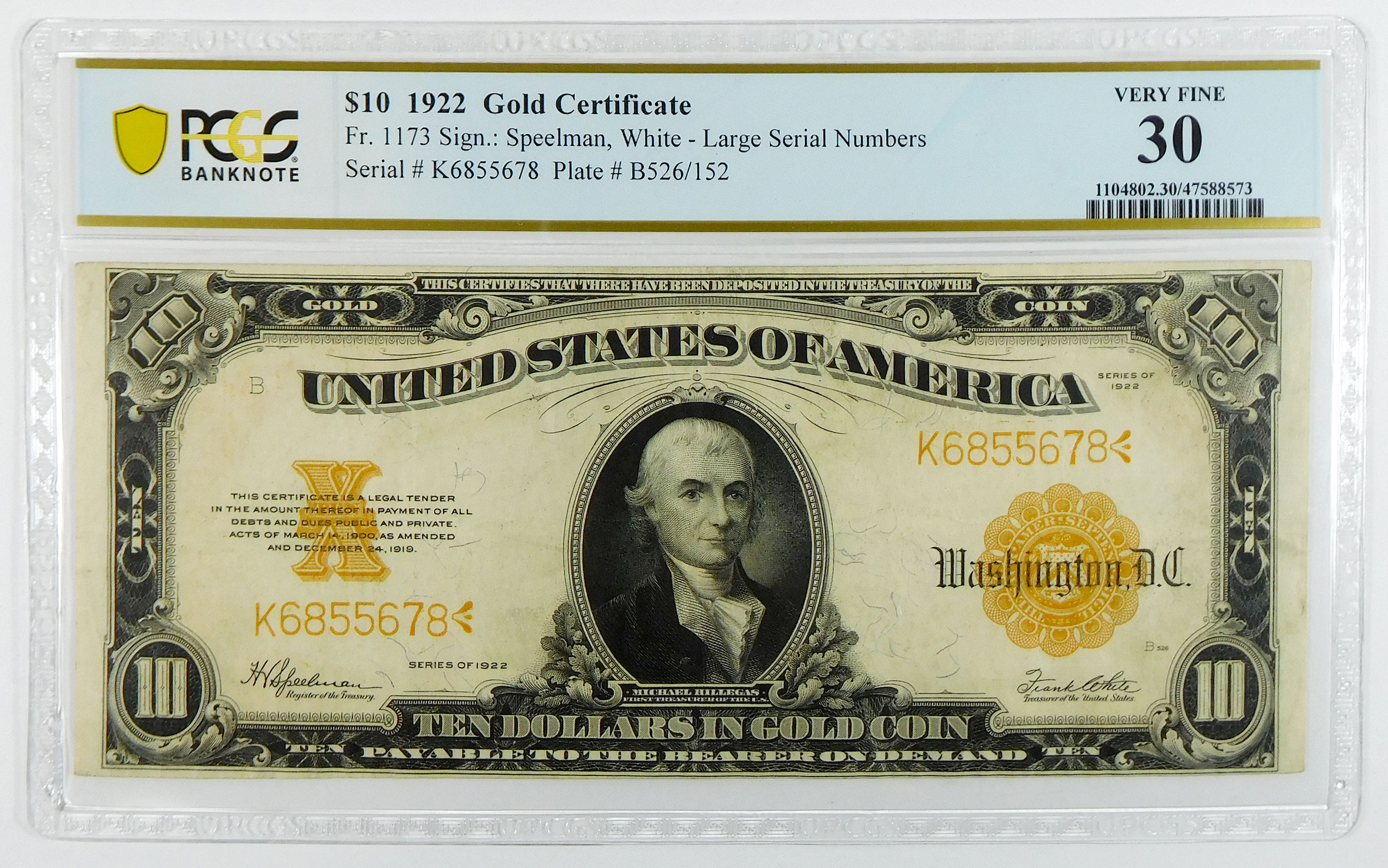 1922 $10 Gold Certificate – Fr#1173 – Large Serial Numbers – PCGS 30 Very Fine