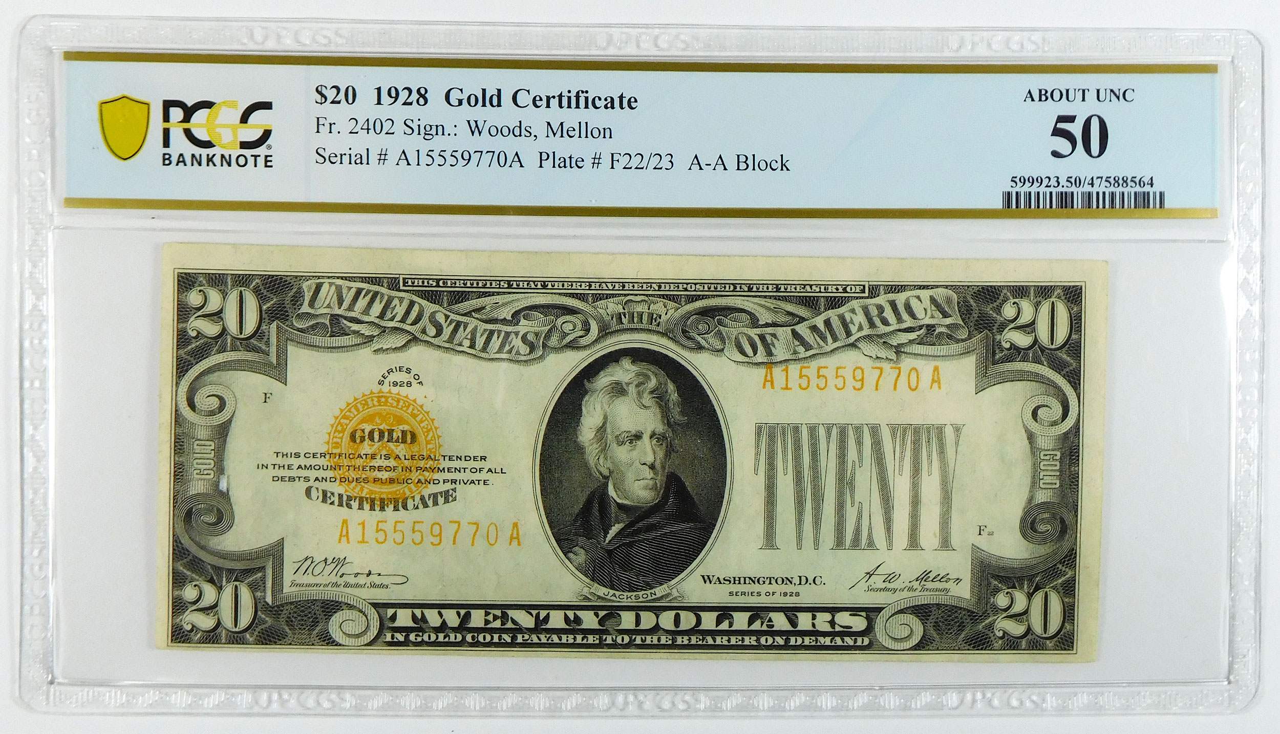 1928 $20 Gold Certificate - Fr#2402 - PCGS 50 About Uncirculated quantity