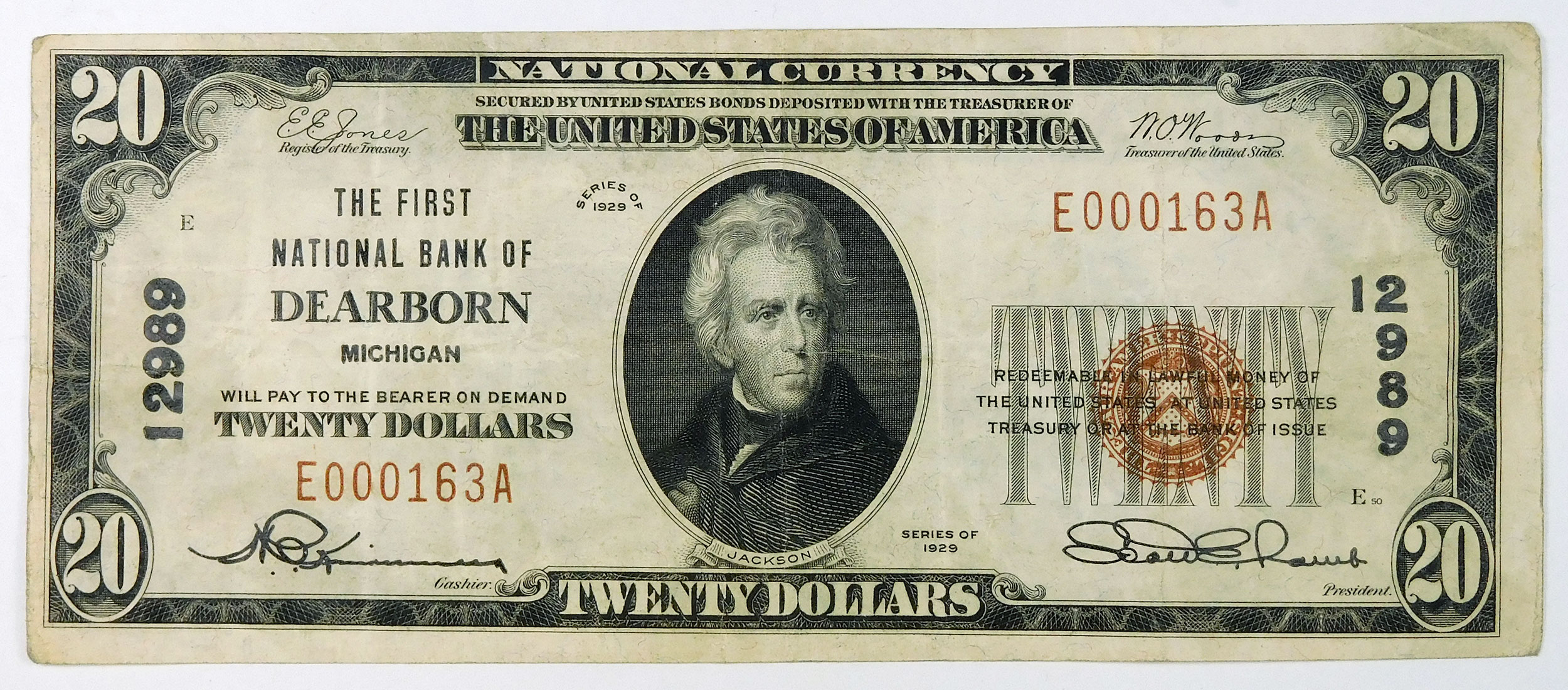 1929 Ty 1 $20 First National Bank of Dearborn, Michigan – CH# 12989