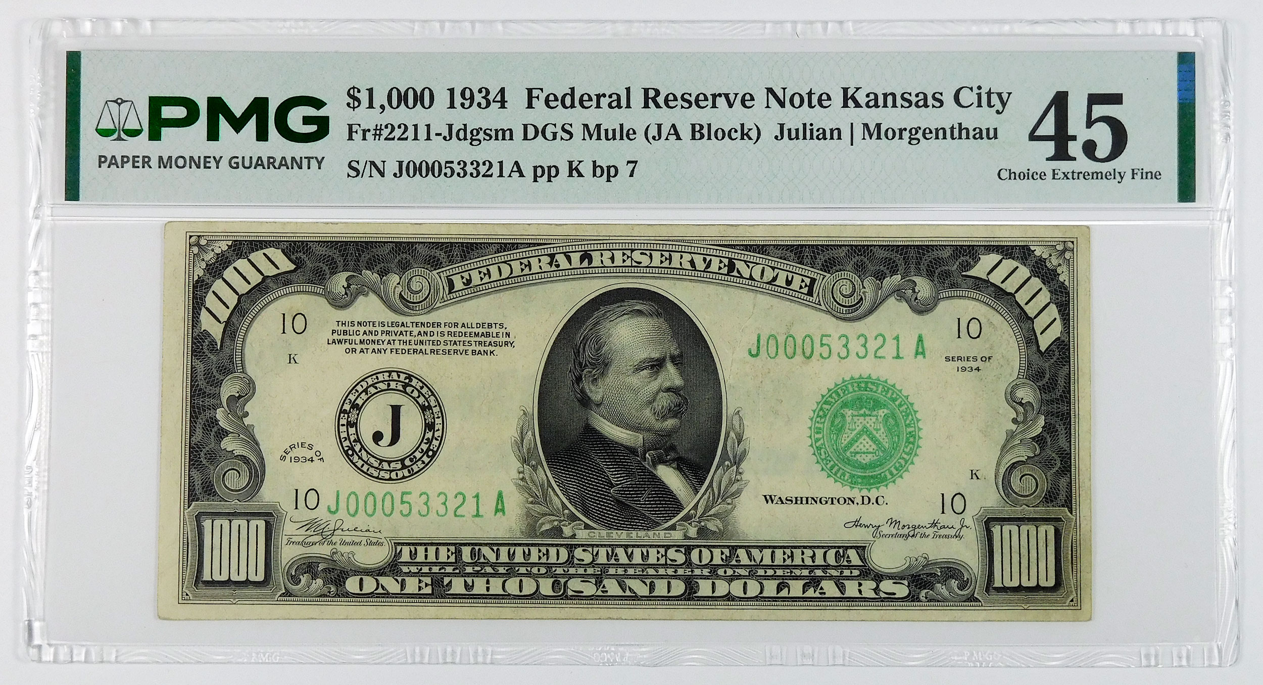1934 $1,000 Federal Reserve Note Kansas City – Fr#2211-Jdgsm Mule – PMG 45 Choice Extremely Fine