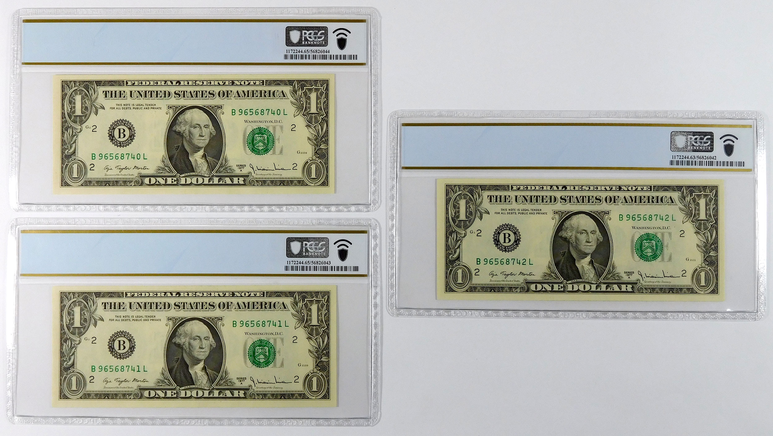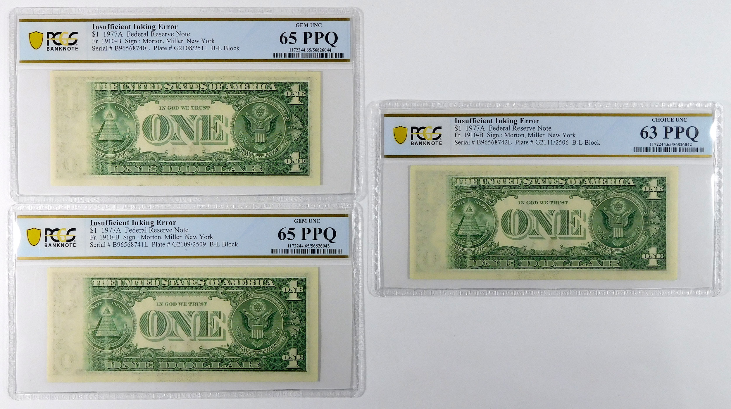 1977A $1 Federal Reserve Note Lot – Fr#1910-B – PCGS 65 & 63 Gem/Choice UNC PPQ – Insufficient Inking Error – Consecutive S/N