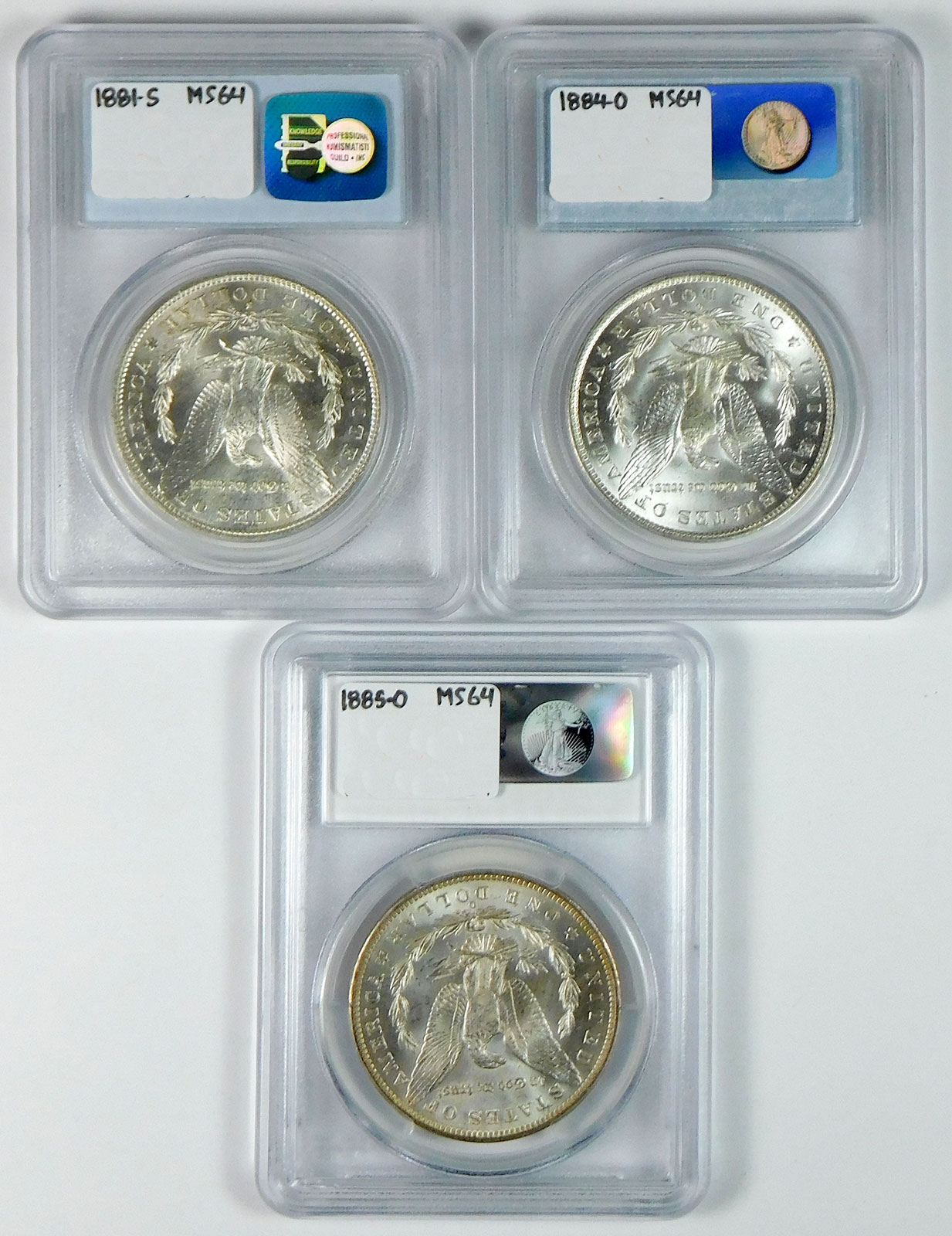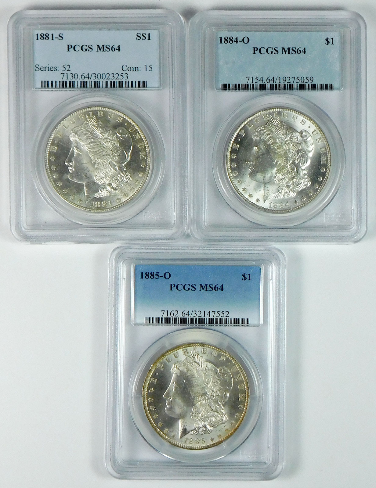 1881-S, 1884-O & 1885-O Morgan Silver Dollar Set – PCGS MS 64