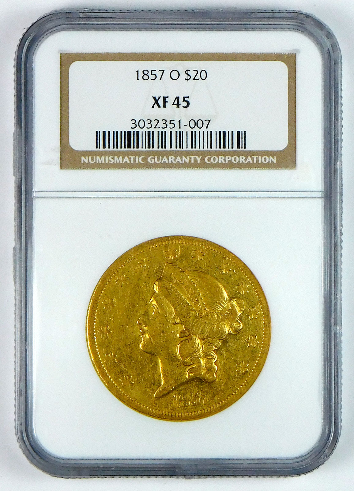1857-O $20 Gold Liberty Head Double Eagle – NGC XF 45