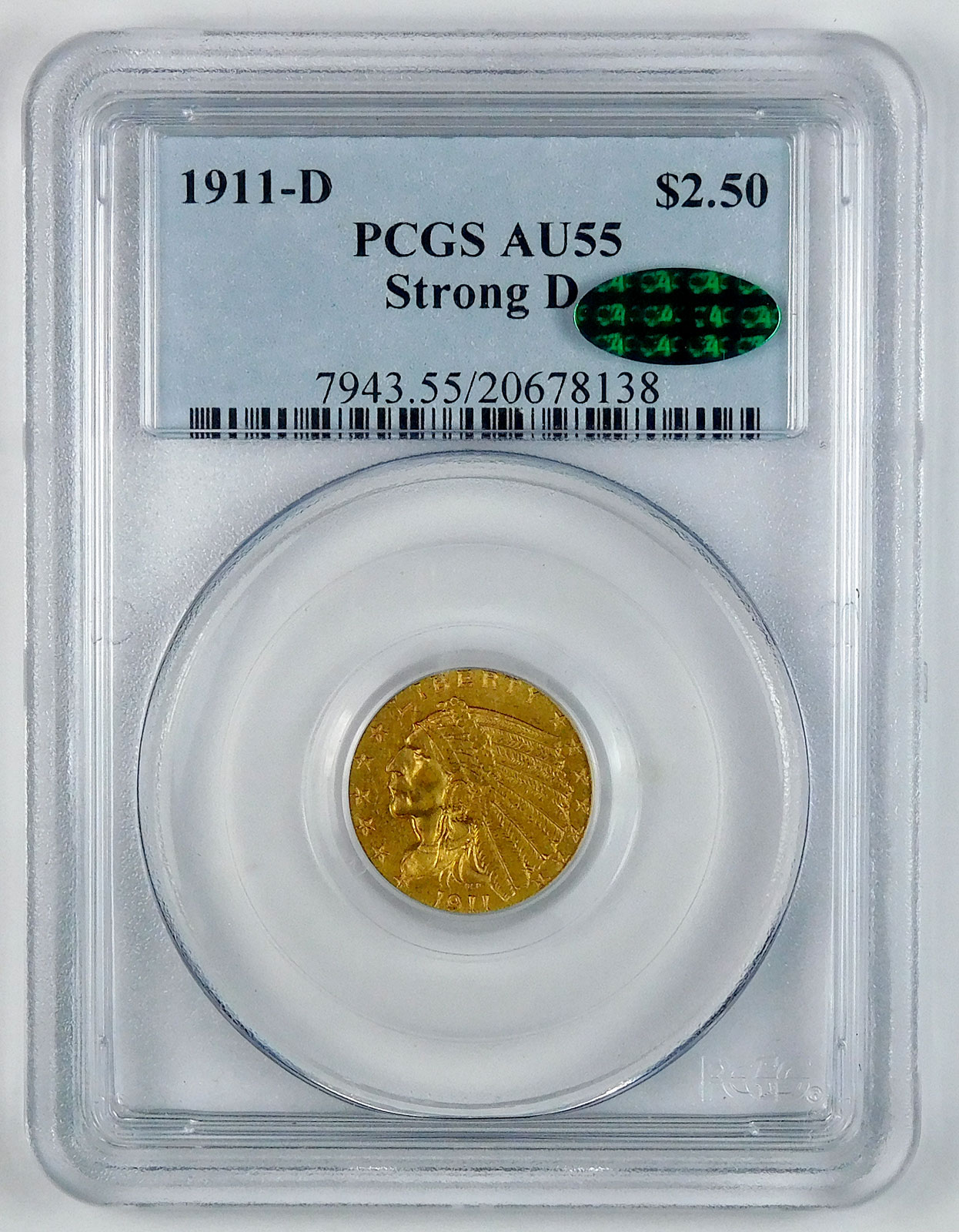 1911-D Strong D $2.5 Gold Indian Head Quarter Eagle - PCGS AU 55 - CAC quantity