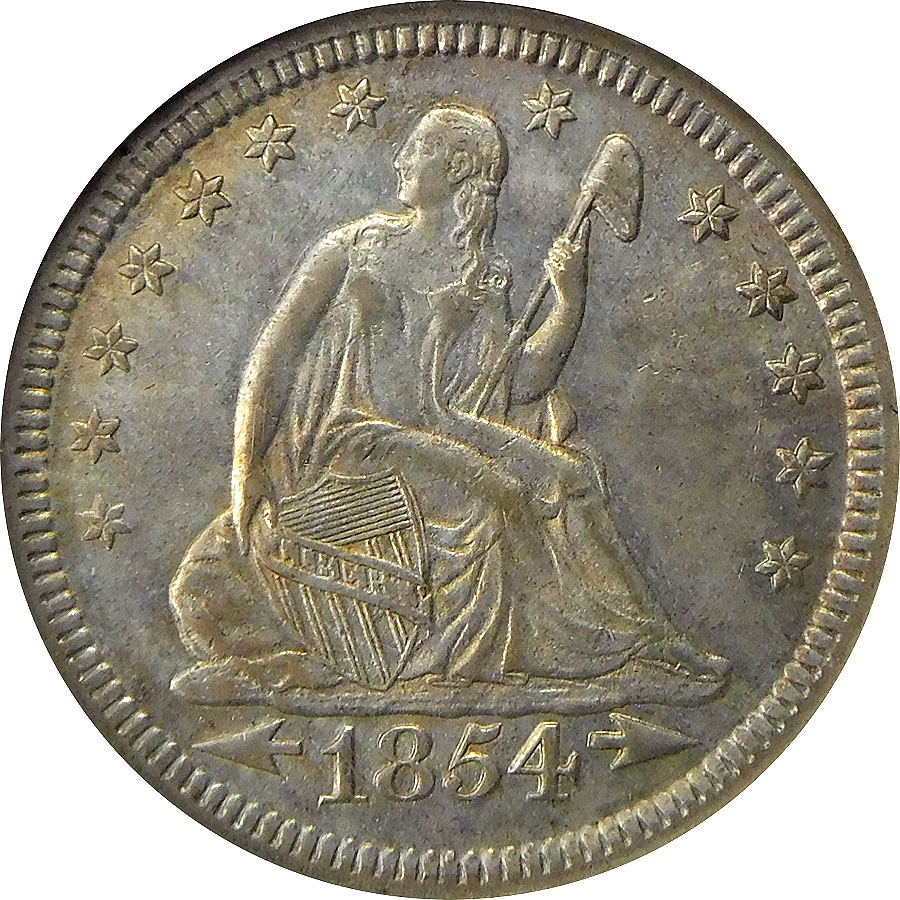 1854 Arrows Seated Liberty Quarter – NGC AU 58